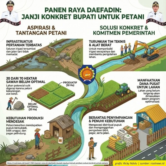 Momen panen raya ini dimanfaatkan Bupati Paulus untuk berdialog langsung, mendengarkan, dan menanggapi aspirasi para petani terkait infrastruktur pertanian serta kebutuhan produksi. Ia menegaskan komitmennya menindaklanjuti keluhan tersebut demi mendukung ketahanan pangan melalui program Mbule Sio “ROTE BERTANI”.