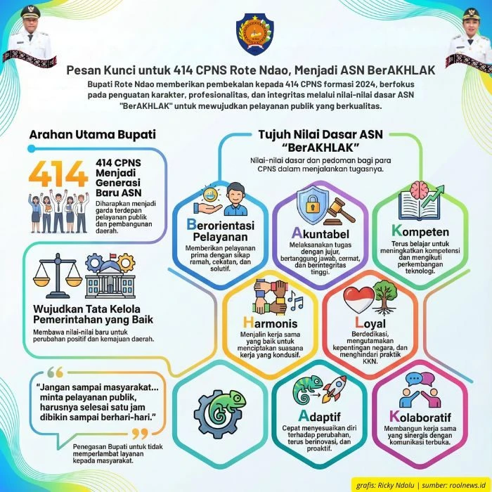 Dalam kesempatan tersebut, Bupati Paulus Henuk menekankan tujuh hal penting yang menjadi nilai-nilai dasar dan pedoman bagi para CPNS dalam menjalankan tugas sebagai ASN BerAKHLAK (Berorientasi Pelayanan, Akuntabel, Kompeten, Harmonis, Loyal, Adaptif, dan Kolaboratif).